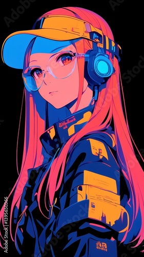 fun, youth, scene, nightlife, visor, art, accessory, character, futuristic, culture, expression, girl, hip, playful, glowing, creative, fantasy, trendy, city, cassette, retro, imaginative, dynamic, neon, music, aesthetic, pop, digital, walkman, illustration, style, design, earring, sunglasses, bold, anime, fashion, entertainment, cool, urban, colours, vibrant, modern, geometric, lively, unique