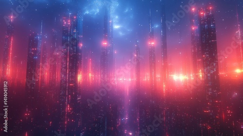 city landscape, futuristic, neon, night, city, metropolis, skyscraper, building, light, glow, red, pink, blue, purple, digital, art, illustration, fantasy, science, fiction, technology, modern, abstract, urban, architecture, design, aesthetic, vibrant, atmosphere, dreamlike, evocative, surreal, glowing, bright, dark, energy, scene, future, nightlife