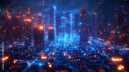 city landscape, futuristic, neon, digital, metropolis, technology, urban, night, glowing, light, skyscraper, building, modern, network, circuit, electric, science fiction, advanced, innovation, progress, future, blue, orange, energy, illuminated, bright, vibrant, dynamic, artificial, intelligence, datum, grid, line, pattern, dark, abstract, computer