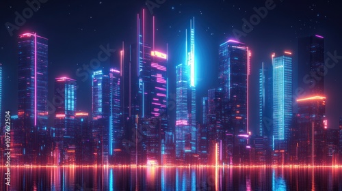 city landscape, night, skyscraper, urban, neon, light, water, architecture, modern, building, futuristic, glow, city, dark, star, digital, technology, bright, blue, pink, orange, purple, graphic, design, illustration, art, abstract, style, high-coloured, dynamic, colourful, scene, horizon, light, landscape, structure, metal, steel, glasses, concrete