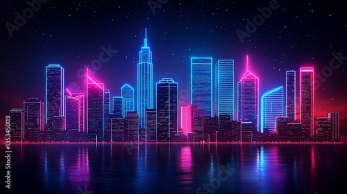city, night, neon, light, skyline, building, skyscraper, urban, landscape, futuristic, glow, electric, colourful, pink, blue, purple, dark, star, water, modern, architecture, design, technology, abstract, vibrant, energy, illumination, bright, scene, view, illustration, graphic, artwork, digital, art, image, background, panorama, metropolis, downtown, travel, tour tourism, fantasy, retro, style, aesthetic