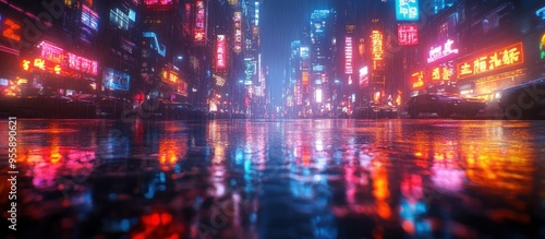 city landscape, rain, neon, street, night, city, light, building, wet, urban, architecture, dark, glowing, electric, street light, light, colours, colourful, modern, bright, futuristic, high-coloured, landscape, sky, water, wetness, asphalt, evening, downtown, abstract, rainwater, signs, illuminated, vibrant, digital, artistic