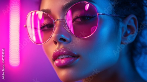 Neon Fashion Portraits: Stylish Woman with Pink Glasses in Futuristic Lighting