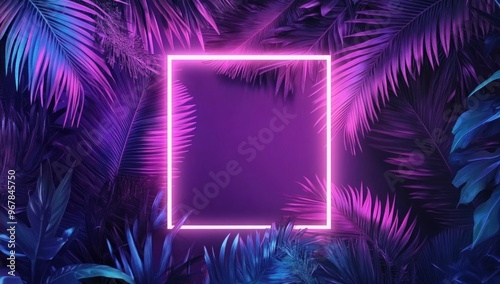 leaf, tropical, palm, neon, frame, plant, nature, green, purple, blue, glow, light, bright, foliage, abstract, design, pattern, texture, background, illustration, digital, art, graphic, colours, high-coloured, dark, shadow, vibrant, illumination, minimal, aesthetic, modern, style, natural, beauty, fantasy, colours