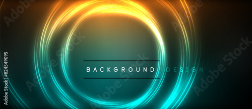 Neon glowing circle rays, light round lines in the dark, planet style neon wave lines. Energetic electric concept design for wallpaper, banner, background