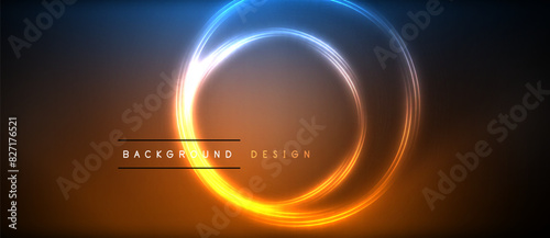 Neon glowing circle rays, light round lines in the dark, planet style neon wave lines. Energetic electric concept design for wallpaper, banner, background