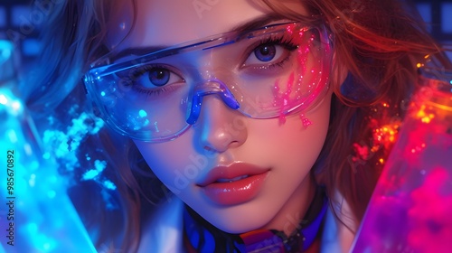 neon, futuristic, girl, woman, goggles, goggles, science, laboratory, experiment, closeup, portrait, blue, pink, red, lighting, glow, light, glasses, shiny, style, fashion, beauty, female, eye, lip, bright, colourful, fantasy, science fiction, digital artwork, illustration, artistic, abstract, design, graphic, vibrant, trendy, modern, cool, aesthetic, creative, technology, imagination, future, surreal, dreamy, inspiration