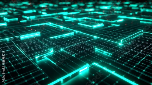 Neon Green and Blue Abstract 3D Render Background with Digital Grids and Glowing Edges