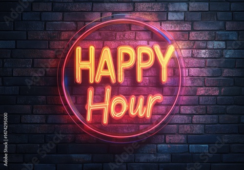 happy, hours, neon, signs, brick, wall, nightlife, bar, pub, eatery, celebration, drink, alcohol, orange, pink, glowing, bright, dark, texture, round, circular, advertising, promotion, night, evening, fun, party, social, gathering, modern, stylish, trendy, design, graphic, illuminated, light, electric, vintage, retro, aesthetic, background, text, typography, message, invitation