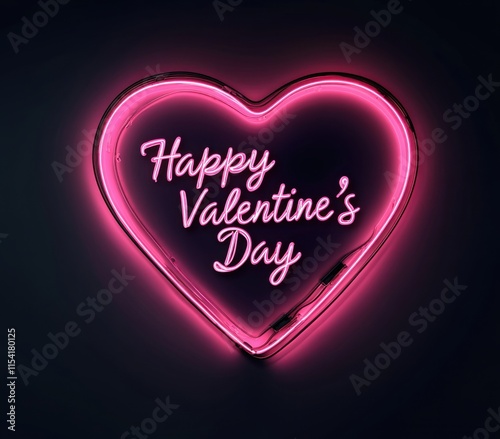 Neon heart-shaped sign spelling out Happy Valentine's Day on a dark background