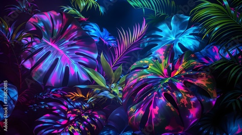 neon, jungle, foliage, leaf, tropical, vibrant, colourful, plant, monstera, palm, exotic, nature, greenery, lush, rainforest, glow, purple, blue, green, red, artistic, abstract, background, design, pattern, organic, flora, botanical, garden, decorative, high-coloured, illumination, modern, creative, fantasy, surreal, atmosphere, serenity, calmness, texture, environment, paradise