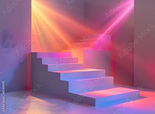 stair, neon, light, minimalism, three-dimensional, rendering, abstract, background, design, art, colourful, graphic, geometric, interior, modern, room, studio, shadow, pattern, texture, style, gradient, colours, ray, effect, shape, surface, futuristic