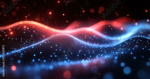Neon Light Waves. Abstract glowing waves digital background with blue and red neon light particles, futuristic technology design for presentations, websites, banners, or sci-fi themes in dark space e