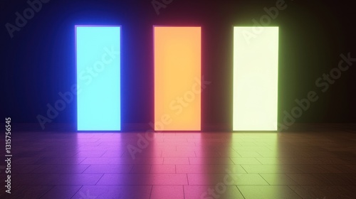Neon Lights Abstract: Vibrant Colored Panels Illuminate Dark Room