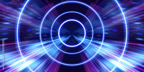 Neon lights in blue and pink create a mesmerizing tunnel. This futuristic graphic design captures the concept of movement and energy in a glowing, infinite space.