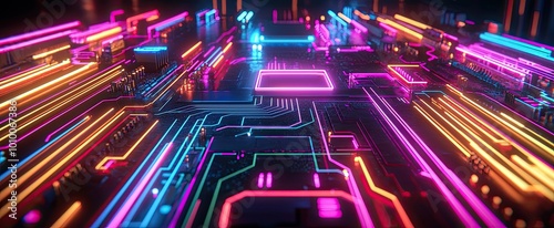 circuit, board, neon, light, abstract, technology, futuristic, glow, digital, electronic, design, pattern, line, stripes, pink, blue, yellow, orange, colours, vibrant, bright, graphic, modern, style, background, dark, black, three-dimensional, render, illustration, surface, texture, concept, artwork, creative, energy, power, signal, flow, connection, datum, wire, network, structure, electrical, component, processor, chips