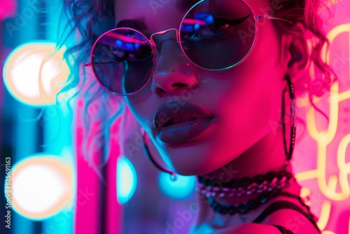 woman, portrait, neon, light, sunglasses, colourful, nightlife, fashion, style, glamour, retro, vintage, urban, cool, trendy, bold, bright, glowing, pink, blue, purple, magenta, cyan, electric, high-coloured, intense, futuristic, modern, contemporary, dark, shadow, contrast, eyewear, jewellery, make-up, hair, face, eye