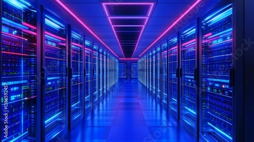 server, room, rack, neon, hallway, computer, datum, center, technology, modern, digital, future, innovation, storage, network, hardware, software, connectivity, computing, infrastructure, security, cyber, tech, business, processing, cloud, cyberspace, virtual, global, system, design, interior, architecture, visualisation, rendering, three-dimensional, illustration