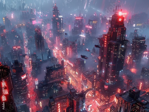 Neon Nights: Hyper-Realistic 3D Rendering of Futuristic Cityscape with Flying Vehicles and Advanced Technology Elements