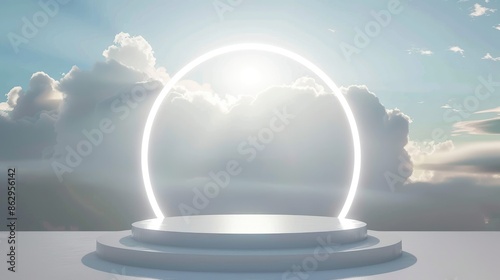 Neon podium product on cloud and sky background, geometric shape for product display presentation, podium, stage pedestal or platform, Promotion display, 3D.