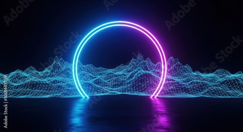 Neon Portal Over Wireframe Landscape Reflecting in Dark Water