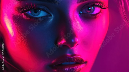 face, woman, portrait, neon, light, pink, blue, beauty, fashion, glamour, make-up, eye, skin, closeup, model, lighting, artistic, vibrant, colours, style, expression, intense, dramatic, glow, shine, red, purple, dark, shadow, contrast, texture, photographic, image, digital, art, graphic, visual, modern, trendy, stylish, aesthetic
