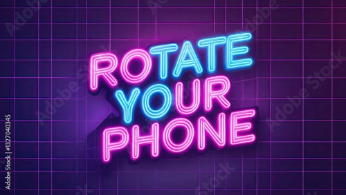 Neon sign glowing in vibrant pink and blue colors with a retro grid background, suggesting to rotate a mobile device