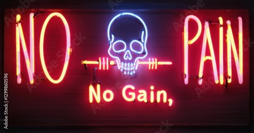 Neon sign no pain gain tattooed skull glowing needle deep fiery red accents bright colorful realistic photo