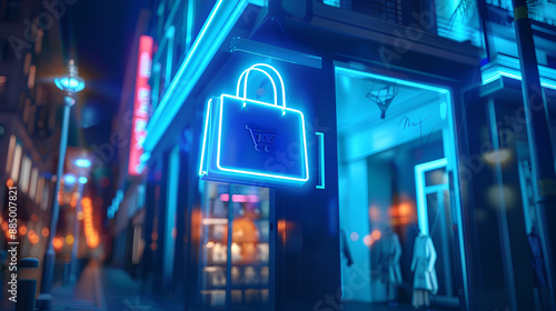 Neon sign of a shopping bag icon above the entrance of a trendy store