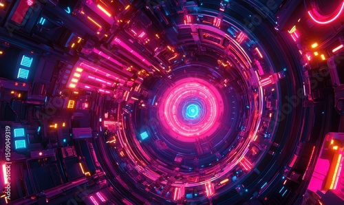 Neon tunnel, vibrant lights, futuristic travel, abstract background, digital art