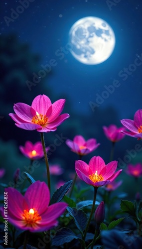 Neon-colored flowers blooming under moonlight, botanical lighting, floral glow, illuminated petals