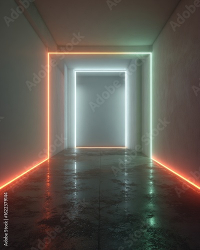 neon, corridor, tunnel, light, colours, glow, geometric, empty, modern, future, abstract, space, architecture, interior, design, three-dimensional, illuminated, rectangle, wall, floor, concrete, perspective, forward, pathway, empty space, light effect, graphic, digital, art, illustration, technology, structure, glowing, orange, blue, green, bright, roomy, clean, contemporary, minimalist, digital artwork
