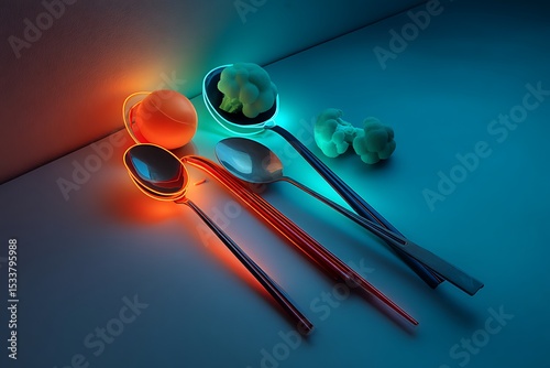 Neon-lit cutlery with broccoli and an orange, showcasing a vibrant and modern take on healthy eating.