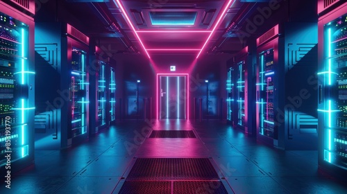 server, room, neon, light, glowing, doorway, futuristic, technology, digital, datum, network, computer, hardware, science, fiction, dark, blue, pink, purple, abstract, minimal, geometric, architecture, design, style, interior, metal, steel, grid, pattern, line, shape, floor, wall, ceiling