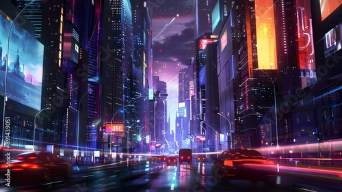 Neon-Lit Skyscrapers: Futuristic Night Cityscape with High-Speed Traffic