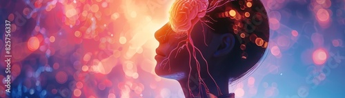 nervous system close up, focus on, copy space bright synaptic colors, double exposure silhouette with nerves