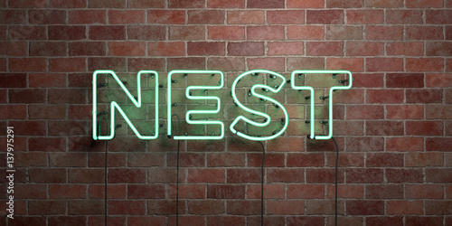 NEST - fluorescent Neon tube Sign on brickwork - Front view - 3D rendered royalty free stock picture. Can be used for online banner ads and direct mailers..