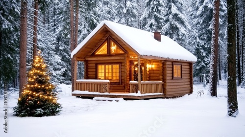 Nestled in the snowy woods, the cozy cabin glows with warm lights as dusk settles. A small Christmas tree adds festive charm among the snow-covered trees