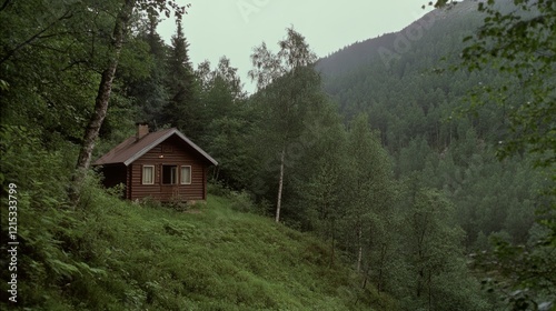 Nestled on a forested hillside, a quaint cabin sits serenely among lush green trees, offering a secluded retreat and a perfect escape to nature.