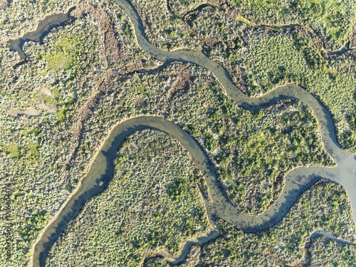 Network of channels and streams at low tide. In the marshland of Isla Cristina. Aerial view. Drone shot. Huelva province, Andalusia, Spain