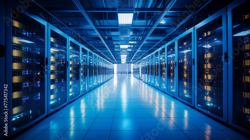 Network Server Room with Reflective Floor and Blue Neon Lighting