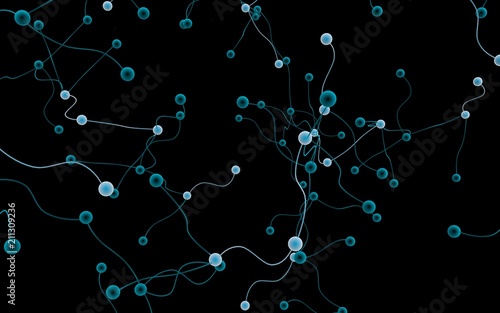 Neural network. Social network. Futuristic dna, deoxyribonucleic acid. Abstract molecule, cell illustration, mycelium. Dark background. 3D illustration