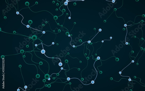 Neural network. Social network. Futuristic dna, deoxyribonucleic acid. Abstract molecule, cell illustration, mycelium. Dark background. 3D illustration
