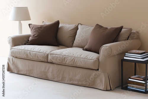 sofa, couch, pillow, interior, design, home, decor, furniture, living, room, style, modern, comfortable, relaxation, beige, cushion, lampshade, light, floor, neutral, book, stack, table, contemporary, minimalist, simple, clean, cosy, apartment, residence, comfort, indoor, house, soft, fabric, textile, decoration, elegance, leisure, simplicity, arrangement, serenity, quiet, still life