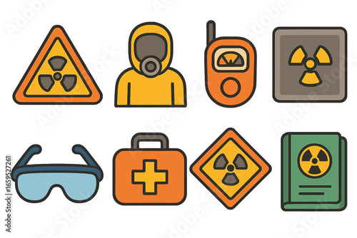 neutron, radiation, safety, icon, flat, vector, mini, illustration, colours, children, warning, signs, protective, suit, lead, shield, goggles, emergency, kit, hazard, manual, design, designed, all