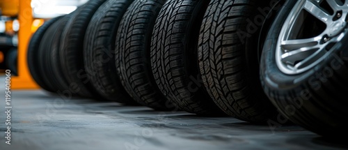New Car Tires Auto Repair Shop Closeup of Rubber Tires