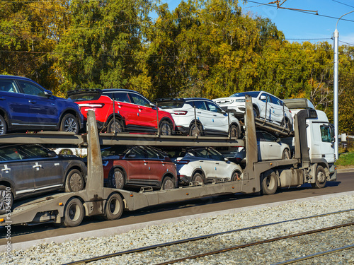 carrier, carrying, highway, traffic, trucking, vehicle, industry, car, road, auto, automotive, bumper, cargo, commercial, delivery, down, driving, export, expressway, freight, good, heavy, horizontal, load, lorry, merchandise, no people, platform, ship, shipment, trailer, transport, transportation, truck, automobile, full, hauling, industrial, photo, transporter, business, conveyance, modern, new, roadway, rush hour