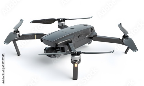 New dark grey drone quadcopter with digital camera and sensors flying isolated on white.