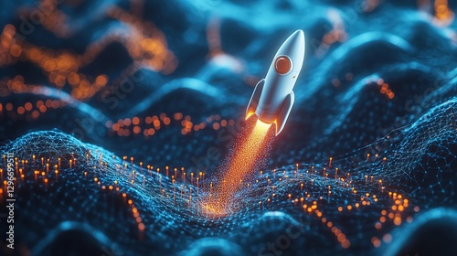 New project and Startup concept with rocket flying up with dotted trajectory above light growth graph on blue technology background. 3D rendering