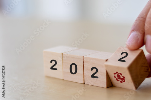 New skill concept from technology transformation learning in 2022. Hand flips wooden cubes 2022 and new skill symbol in bright background and copy space. Reskill, upskill, human resource management.